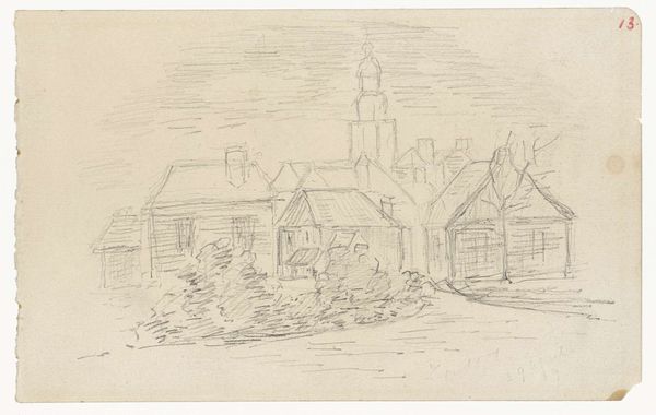 Curator: Today we're looking at a work by John Marin, "Untitled (Landscape with Houses) [verso]," a pencil drawing offering a glimpse into his stylistic versatility. Editor: My immediate impression is one of sparsity. It has a stark, almost desolate quality despite being a landscape. The pencil strokes create this skeletal framework of buildings and suggestion of forms. Curator: Interesting you say that, as this work really captures the tension between civilization and nature through fairly simple shapes and forms. Note how Marin utilizes the cityscape genre here, perhaps commenting on community and belonging within rural environments. What I see reflected are values of ruggedness and steadfastness. Editor: The line work reinforces that. The quick, almost frenetic quality to some of the strokes around the bases of the buildings juxtaposed against the clean angled strokes in the wooden facades and pitched roofs, it almost implies an untamed presence creeping through a man-made one. Also, I like the light and shadow, it’s so clearly represented that even with such sparsity there's still an unmistakable atmosphere and visual direction here. Curator: Exactly, you've touched on the key symbols. I feel a deeper story about pioneers comes to mind. There are stories rooted in these humble dwellings, a representation of basic shelter and shared labor. They serve as anchors within their time period in history as new settlements start to materialize across the land. Editor: I can also see a relationship between art and life reflected. These simple drawings speak to Marin’s practice, and there’s a way he translates a larger scene down into key marks which he clearly understood well. In an environment lacking of obvious markers to distinguish objects, the work stands out for what is said, but also for what it leaves unsaid. Curator: The use of materials certainly makes this more apparent too, pencil drawings can capture history in really engaging ways! We can appreciate both its structural sophistication and thematic density, all within this intimate drawing. Editor: Indeed, it’s fascinating how just a few lines can hold so much narrative weight and formal expression.