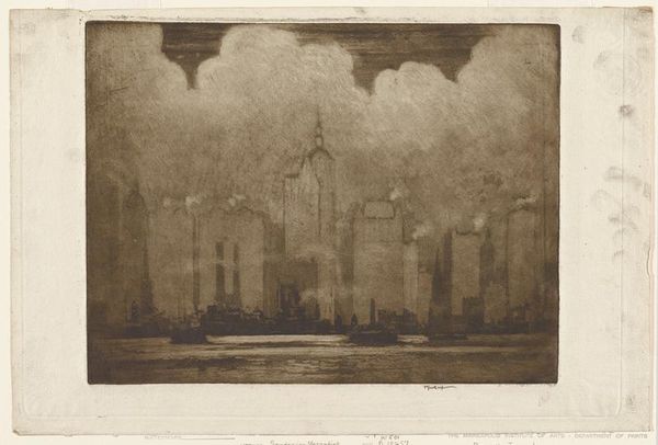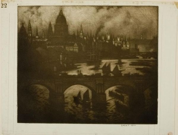 Joseph Pennell made this etching, Wren’s City, using a plate and sheet of paper. The tones are beautifully modulated. It's amazing how the etched line can create such a range of darks and lights. I love how the city emerges from the gloom, the spires and dome of St. Paul's Cathedral looming in the distance. Pennell’s lines are not overly descriptive, but he seems to suggest an atmosphere. In the foreground, the arches of the bridge provide a frame for the river, with a boat sailing through one of the openings. It is a scene of subtle tonal variation, where light and shadow interplay to create a sense of depth and mystery. It reminds me of Whistler's nocturnes, where the city becomes a dreamscape. Ultimately, the beauty of this piece lies in its ability to suggest more than it shows.