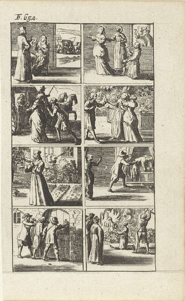 This undated print, whose author is unknown, presents twelve vignettes of everyday life. The images offer us a window into the social mores of its time, which I would guess to be late 18th or early 19th century France. Each scene is labeled with a title such as "The Fisherman," "The Banker," or "The Gossips," giving us a clue as to the social roles and activities that were considered noteworthy. The figures' clothing, poses, and interactions can be read as visual codes that speak to class, gender, and social status. The print seems to comment on the social structures of its time, offering a glimpse into the lives of both the working class and the bourgeoisie. It is neither overtly conservative nor progressive, but rather presents a slice-of-life view of French society. To understand this print better, we might consult historical sources on fashion, social customs, and economic conditions in France during the late 1700s and early 1800s. By situating the print in its social and institutional context, we can gain a deeper appreciation for its meaning and significance.