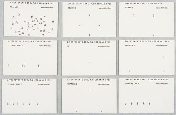 Curator: This is "Paper Flux Work" by Willem de Ridder, part of the Fluxus movement. It’s a set of instruction cards, each prompting a different action or intervention. Editor: It has a playful feel. The starkness of the cards and the simple instructions seem almost like a game, albeit a somewhat cryptic one. Curator: Exactly. Fluxus was all about blurring the lines between art and life. The instructions invite participation, disrupting traditional modes of art consumption. They ask us to question the artist's authority and the artwork's fixed meaning. Editor: There's a subversive element too. Instructions like "don't perform this event" or "send this card to your neighbour" challenge social norms and invite us to think about our relationships and interactions. Curator: The beauty of Fluxus lies in its accessibility and dematerialization of art. It was a direct response to the elitism of the art world, giving agency to the viewer. Editor: It leaves me thinking about the power of instruction, performance, and the unexpected ways art can infiltrate our daily lives. Curator: For me, it highlights art's potential for social intervention and the constant renegotiation of artistic boundaries.