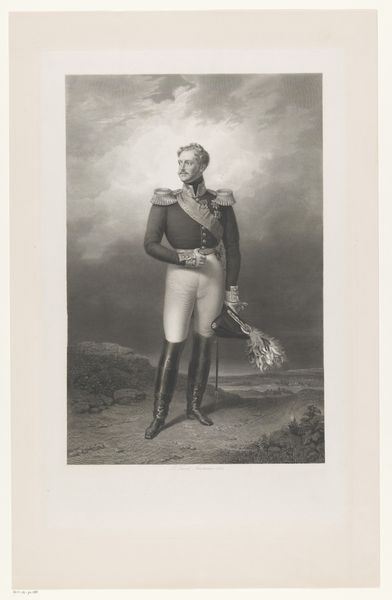 Curator: This engraving, tentatively dated between 1830 and 1839, depicts Willem II, King of the Netherlands. Its academic-art style, referencing both neoclassicism and baroque sensibilities, makes for an intriguing study. Editor: It feels stiff, doesn’t it? Regal, certainly, but also rather constrained. The greyscale lends it a detached air, like a document rather than a celebration. Curator: Well, we need to consider the historical context. Prints like these served a very specific public function. They were designed to circulate images of power and project authority, influencing public perception. The portrait aimed to convey legitimacy at a time of political upheaval. Editor: I suppose, but does it work? Looking at it now, the abundance of detail—the epaulettes, the elaborate decoration—feels like overcompensation, a sort of performative masculinity in a world undergoing major change. There’s something quite vulnerable in that stiff pose and fixed stare. Curator: It reflects the complex politics of the time, where the Netherlands was navigating the independence of Belgium, for example. Willem II's stance becomes especially significant, he wasn't just posing but performing in a politically volatile environment, carefully constructed through imagery. Editor: And what about the framing of that image? He’s flanked by symbols of power and affluence—furniture, a draped curtain, a sword. They almost imprison him! Curator: Such framing reinforces a traditional understanding of royal power, absolutely. But also think of the act of reproducing the image; it democratizes power while simultaneously preserving the social hierarchy by mass-producing the royal persona. These prints made him omnipresent in the lives of people. Editor: Interesting point. Considering contemporary concerns about image proliferation and manipulated realities, there’s something rather unnerving about this manufactured, yet undeniably 'historical,' representation. It’s a reminder that the power of the image to shape perceptions—and manipulate realities—isn’t new at all. Curator: Absolutely. Thinking about its intended impact and enduring resonance opens discussions about visual representation.