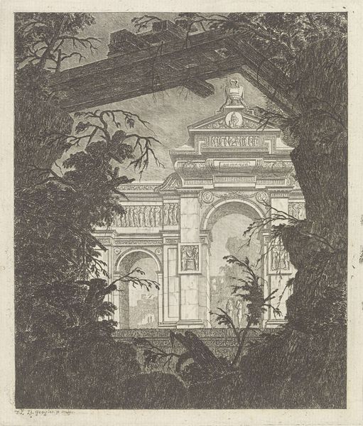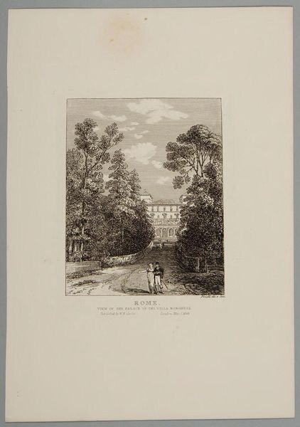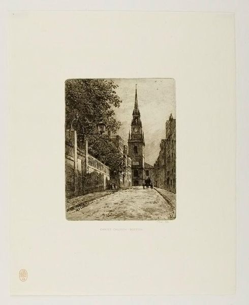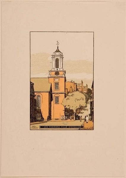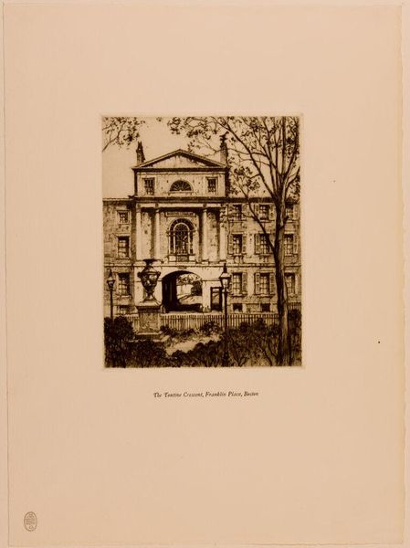 Editor: So, this is Rudolph Ruzicka's "View of University Hall, Harvard University, Cambridge." It seems like a print, perhaps early 20th century. It's a very orderly and serene scene. What strikes you about it? Curator: It is indeed serene, reflecting the idealized image Harvard cultivated. The Latin inscription at the top translates to 'Accept my discipline, and not silver'. Consider how this reinforces the institution's emphasis on intellectual, rather than material, wealth. It’s a carefully constructed narrative. Editor: So, it’s a kind of visual propaganda? Curator: Precisely. Ruzicka, through his deliberate composition and the inclusion of the inscription, participates in shaping Harvard's public image. A monument to institutional self-representation. Editor: That's fascinating. I'll definitely think about the image in a different light now. Curator: Good, understanding art is understanding its role in society and power dynamics.