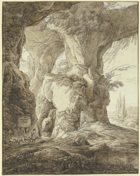 Curator: Before us hangs "Felshöhle mit lagernden Figuren", currently held at the Städel Museum, and attributed to Franz Kobell. The work renders a cave scene with figures rendered in charcoal and ink. Editor: My initial feeling is one of intense quietude, a refuge found in the enormity of nature. It’s primarily monochromatic, a spectrum of grays really emphasizes texture in the stone. Curator: Note how the artist uses the cave's mouth as a framing device. We are inside, looking out, a common motif in Romanticism suggesting the self’s place within the world, and beyond it. Light and shadow play a critical role, no? Editor: Absolutely. The contrast pulls my eye through different material densities: from the rough charcoal strokes defining the rocks, down to the subtle gradations used in the distant landscape created with washes of ink. Curator: I see, also, in these figures a hint of the picturesque, those moments sought after by tourists, which are often composed of idealized, rustic people relaxing or laboring in the face of untamed Nature, in a nod towards the sublime. The travelers as almost archetypal symbols of Man against nature. Editor: It strikes me that the artist hasn’t given much focus to detailing the figures; instead it's really about how the landscape defines their very existence. What impact did the relative low cost of drawing as a medium have in that period, I wonder? Curator: Good question. Perhaps its very accessibility contributed to its ubiquity? The materials speak, as you say, about this artist’s relationship to craft and to audience. A study made perhaps in plein air. Editor: That sense of being outdoors translates directly through the artist's choice of materials. Charcoal, ink, paper - grounded, natural substances brought together to form this cavernous shelter. It makes one think about value placed on skill as craft. Curator: A quiet but rich piece, offering many entry points into understanding Romantic aesthetics. Editor: Exactly. A real insight into a dialogue between humanity and its environmental impact throughout the ages using minimal, raw materials.
