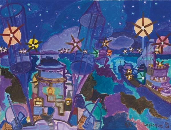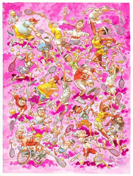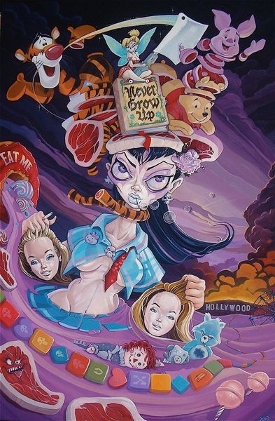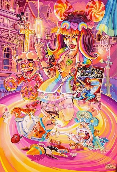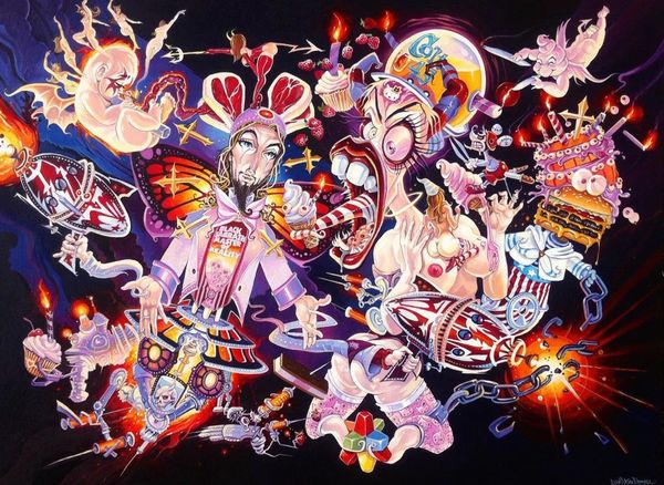 Dave Macdowell made this painting, ‘Another Perfect Day’, sometime in the 20th century, probably with acrylics. The painting is a visual feast, or maybe a visual overindulgence, of pop culture icons skewered with a dark, satirical edge. Look at the density of the painting and the way the characters seem to pile on top of each other! Macdowell’s brushstrokes are visible, creating a slightly chaotic and frenzied atmosphere. The colours are saturated, almost aggressively cheerful, but there's an underlying unease. The painting has an almost hallucinatory quality. I keep coming back to the sign that reads "Miseryland" - and I guess that sums it up! There's a manic energy to this work, similar to the dark humour of artists like R. Crumb. It's a reminder that art doesn't always have to be pretty; it can be a mirror reflecting back the uncomfortable truths of our culture.
