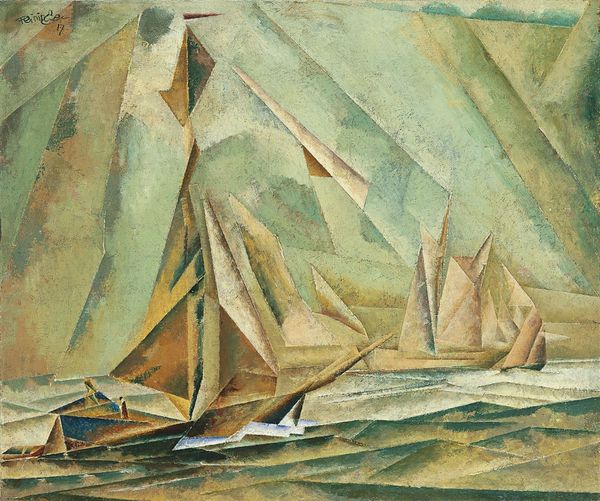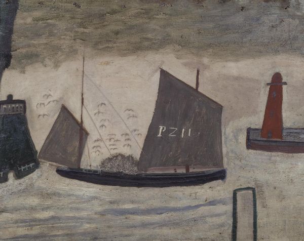 Curator: Gustave Buchet's "Marine," painted in 1951, is a compelling depiction of a ship battling the sea. The artist used a mixed media approach to create the artwork, resulting in an intriguing texture. Editor: My first impression? It feels turbulent and heavy, like a visual storm. The somber color palette, dominated by browns and blues, gives it a somewhat ominous quality. Curator: That’s astute. Consider that in 1951, the world was still reeling from the Second World War and the start of the Cold War. This artwork captures a prevailing sense of anxiety and instability present during the Post-War years, where established political structures faced existential threats and reconstruction was just starting. The artist may have wanted to show the power of nature against man and machine. Editor: From a formal perspective, observe the ship's dramatic tilt and placement within the canvas. Its diagonal axis and the choppy brushstrokes indicating water evoke both dynamism and precariousness. The masts act as visual stress points—vectors adding tension to the composition. The lack of a horizon line contributes to a sense of disorientation, further magnifying the disquieting sensation. Curator: This painting could be a critical commentary of naval power structures during the time or a memorial to sailors lost during war. There may have been a personal connection; Buchet served as an interpreter during the First World War. I'm drawn to the ways it seems to be reflecting and critiquing authority using universal metaphors of sea and storm. Editor: You make an interesting point. I saw that ship as a shape contending with shape. Your contextual reading makes the muted palette even more affecting – those colors aren't just atmospheric; they are carrying socio-historical weight. Curator: Yes, and thinking about "Marine" prompts further inquiry into the artistic networks and patronage of expressionist painting. Considering the impact and effect of art from periods of social unease help us in the contemporary landscape. Editor: Ultimately, what remains most compelling is how Buchet manipulates form and tone to deliver us not merely an image of the sea, but the sensation of facing something immense.