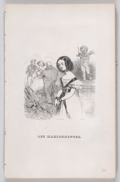 Curator: Ah, here we have "Nebuchadnezzar," an engraving from 1836 by J.J. Grandville, and part of "The Complete Works of Béranger," currently residing at The Met. The artist uses a rather comical approach in addressing historical and political themes. Editor: Well, it certainly doesn’t scream "regal." More like a… well, a staged school play. I see people playing instruments with comical expressions while staring into large musical sheets and a king on his throne with a baby's head on a grown man's body. Curator: Exactly. Grandville was known for his anthropomorphic satire. Here, the reference to Nebuchadnezzar is not a straight historical depiction but a commentary on contemporary French politics, particularly the monarchy of Louis-Philippe. Béranger’s works themselves were quite politically charged, often critical of the regime. Editor: So, Nebuchadnezzar is, in this instance, not really Nebuchadnezzar but an allegory for French royalty? Makes the king even more pathetic, as he seems oblivious, lost in his luxurious chair. I find it interesting how the artist emphasizes these weird harps on both sides of the ensemble. Is it perhaps implying some dissonance between the arts and the monarchy? Curator: That's a brilliant insight. The harps flanking the central figures could indeed represent the forced harmony, or rather the lack thereof, between the arts and the monarchy. Remember, this print appeared amidst censorship and control over artistic expression. Editor: This feels surprisingly subversive for something hanging in the Met. I guess political art has a knack for longevity, if it speaks about social issues still resonant after generations. Curator: Indeed. This image captures a very specific moment in French history, but the broader theme of power, authority, and artistic suppression continues to resonate. It serves as a reminder of the complex relationship between art and the political landscape. Editor: Looking at it again, the apparent ridiculousness makes its seriousness even more haunting. I find it hard to shake off the image, despite its weird, almost playful rendering. Curator: Precisely, that’s the brilliance of Grandville’s approach: to use humor as a vehicle for social criticism. It encourages the viewer to delve deeper into the underlying themes of political commentary.