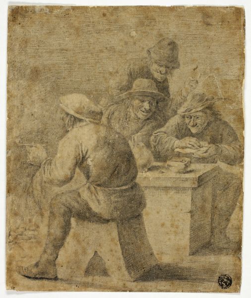 Editor: Here we have Jean Le Pautre’s "Tavern Scene with Carousing Men," rendered with pen, ink, and grey wash on paper. It feels very... chaotic. What’s your take? Curator: Chaos is a good word for it! But let's not simply see chaos, but rather what that chaos *represents*. Tavern scenes were incredibly popular, and often used to depict the lives of ordinary people, but beyond that they also held the potential to reflect broader social and political issues. What societal concerns might such a boisterous tavern scene reflect, considering the historical context? Editor: Maybe anxieties about social order? Like, fear of the working class losing control? Curator: Precisely. The focus on drinking, gambling, and rowdiness could be read as a commentary on social decadence, poverty, or even resistance against oppressive systems. Remember that during the Baroque era, anxieties around class and authority were extremely potent, influencing artistic production in many different ways. Editor: I hadn't thought about it as a form of resistance. So, are you saying it's more than just a snapshot of daily life? Curator: Exactly! Le Pautre uses the tavern as a stage to address power dynamics and class tensions in 17th-century France. Think about who *isn’t* represented. Where are the noble patrons? The servers, maybe women? Their absence speaks volumes. It highlights a singular perspective, which serves to implicitly examine how social hierarchy worked. Does that nuance change your initial read of “chaos”? Editor: Absolutely. It makes me consider whose stories are being told, and whose are being left out of the frame. Curator: And understanding those omissions is essential to interpreting the work’s social commentary and artistic merit. Thanks to our conversation, it offers not only chaotic spectacle but pointed social critique.