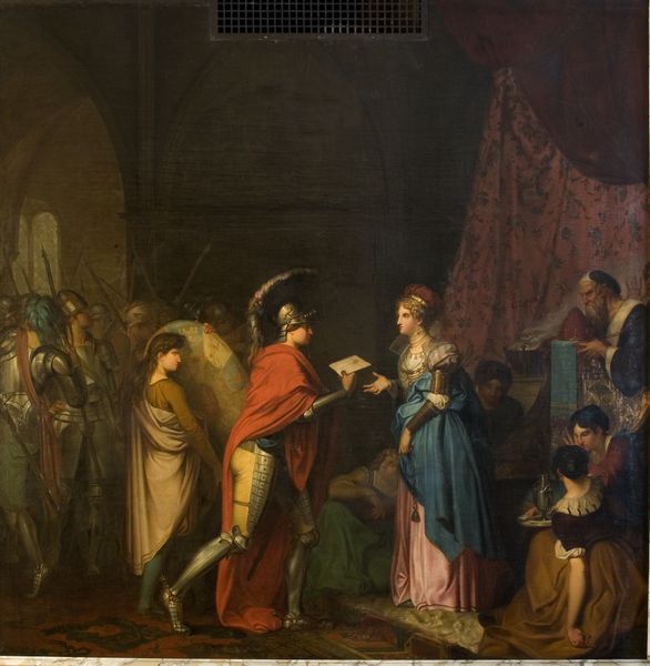 Editor: Here we have "Man Seated while Speaking to a Soldier Who is Standing," attributed to Robert Smirke, using oil paints, a piece hinting at an interaction of significant import. I'm immediately struck by the hierarchical composition, the seated man holding court, perhaps? What can you tell me about its historical context? Curator: A good question! This genre painting seems to be capturing a moment of potential historical or political negotiation. Consider the setting – seemingly a private chamber, yet with onlookers present. Smirke appears interested in the power dynamics inherent in the military and civilian spheres. Do you think the body language tells a story? Editor: It does feel staged; the soldier looks quite stiff, almost pleading, while the seated man is relaxed, contemplative. It's hard to pinpoint a specific era. Do you think it connects with any broader historical narratives? Curator: I wonder if it reflects a romanticized view of conflict or diplomacy, common in history painting of the time. Consider the function of art within 18th and 19th century British society, aimed to instruct viewers through morals embedded in stories, as this painting might have strived to. Do you perceive it engaging a specific social or political purpose? Editor: I now see a purpose – glorifying those power structures, or perhaps subtly critiquing the burdens soldiers carried versus the relative comfort of leadership? Thank you for outlining that context. Curator: Absolutely. Examining it through the lens of its contemporary museum culture and art market, Smirke probably tried engaging both historical appreciation and the theatrical genre within one image, don’t you think? This piece could lead to many socio-political avenues for debate.