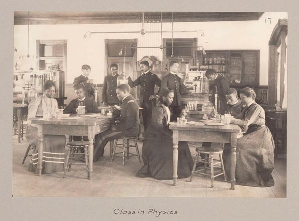 Curator: This is Frances Benjamin Johnston's photograph, entitled "A Dressmaking Class," taken at the Hampton Normal and Agricultural Institute. Editor: It has a quiet, industrious air about it, don't you think? So much potential energy held within that classroom. Curator: Indeed. Johnston's work documents the Hampton Institute's mission to provide vocational training to African Americans. Note how the composition emphasizes order and purpose. Editor: And yet, I wonder, what are they dreaming of as they sew? Do they want to be dressmakers or dream of other freedoms? The light from the window and the dark, almost hidden corners of the room give the image a feeling of both aspiration and constraint. Curator: Absolutely. The photograph prompts a reflection on the complexities of education and opportunity during that time. Editor: It leaves you with questions, doesn't it? More than answers, perhaps.