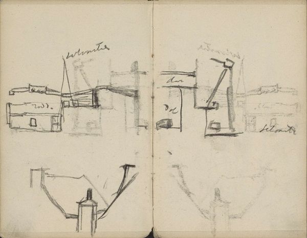 Editor: This is "Houtconstructies en een klokgevel" by Isaac Gosschalk, dating from 1862 to 1867. It’s a pencil drawing on paper. There’s something very intimate and preparatory about it, like a glimpse into the artist's sketchbook. What strikes you most about it? Curator: What intrigues me is how Gosschalk, a figure working amidst the architectural and social transformations of the 19th century, uses this "sketchbook art" to capture the vernacular. It speaks to a rising interest in preserving and studying local building traditions as industrialization swept through Europe. Editor: So, it’s not just a technical drawing, but a record of something socially significant? Curator: Precisely. These aren’t idealized architectural renderings. They seem like observations, almost anthropological, of everyday structures. Notice the "aged paper". It hints at the layers of historical context embedded within this image, suggesting how even a simple sketch becomes a document of cultural transition. How do you see this within the broader art discourse of the time? Editor: I see your point. I suppose I had initially viewed this as purely formal, but you are nudging me to see how images like this also helped construct a visual narrative about Dutch identity during that period. The architecture becomes almost like a portrait of the society itself. Curator: Indeed. This is why it’s critical to investigate what Gosschalk and his contemporaries were showing and preserving in a rapidly modernizing world. Art doesn't exist in a vacuum; it interacts with politics and culture. Considering it that way makes the work much more interesting, I think. Editor: Definitely! It's helped me appreciate how this seemingly simple sketch participates in a bigger dialogue about history and cultural heritage. Thanks!