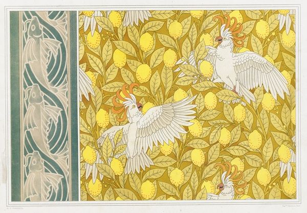 This printed fabric design, "Corbeaux, bordure au pochoir; cigales et chardons," was conceived by Maurice Pillard Verneuil. Notice how the composition is separated into two distinct fields, each showcasing Verneuil’s mastery of pattern. On the right, an all-over motif of thistles and cicadas creates an intricate, naturalistic tapestry. Here, the muted palette of greens, blues, and browns evokes a sense of organic harmony. Verneuil employs a structural repetition that speaks to the industrialized reproducibility of fabric design. Yet, this pattern is not merely decorative; it’s a sophisticated interplay of positive and negative space. The stylized rendering of natural forms flattens the depth of field, creating a visual tension between representation and abstraction. To the left, the stenciled border features stylized ravens in profile, facing one another in a vertical, symmetrical configuration. The formal starkness of this border acts as a counterpoint to the botanical dynamism on the right, inviting us to consider how design functions within different registers of meaning.