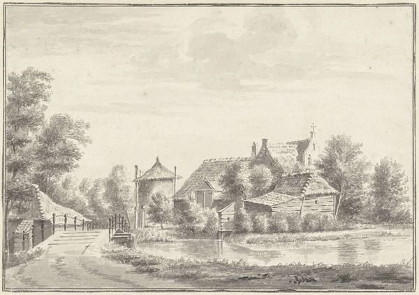 Curator: My eye is immediately drawn to the balanced composition—how would you interpret that, considering the historical context? Editor: Before we get there, just looking at this drawing, its formal elements create a remarkably tranquil mood. The shading is minimal, lending a lightness to the entire scene. Curator: Indeed. What we're looking at is "Grebbesluis" by Jan de Beijer, believed to be created sometime between 1750 and 1757. De Beijer meticulously captures a very specific location. However, this image comes to us from a time steeped in Dutch maritime power and social hierarchies reflected even in its seemingly mundane scenery. Editor: The linear perspective guides the viewer smoothly, punctuated by the vertical mast of the ship—a simple way to establish depth. And observe the reflections in the water; minimal yet effective. Curator: But consider what "Grebbesluis" as a locale might represent within Dutch society. Maritime infrastructure dictated the terms of access to trade and determined the rhythm of urban life. Depictions such as these give us insight into how space itself might have been experienced by the Dutch. What stories are embedded here of economic control, power? Who benefited and who was excluded from these maritime activities? Editor: I see that the material simplicity lends a directness. It's not about ostentatious display but pure representation using the basic elements of line and form. Curator: Exactly! This simplicity may inadvertently obscure critical sociopolitical realities that shape our understandings of the art of this period. This image is more than just aesthetic harmony; it embodies narratives of empire. Editor: You're reminding me of the hidden narratives woven into visual structure—compellingly so! Curator: So, from formal harmony to unseen narratives, aren't we invited into a fuller encounter? Editor: Yes. Each level enriches the dialogue, transforming simple sketches into historical documents, of a kind. Thank you.