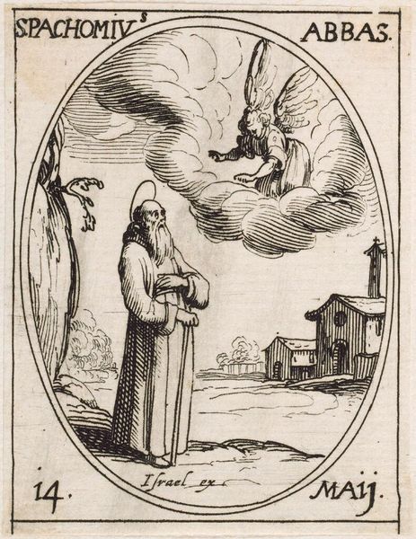 Curator: Jacques Callot created this small etching, “Saint Cyril of Alexandria.” I’m immediately struck by the precision of the lines—it feels both delicate and powerfully graphic. Editor: The social context of Callot’s printmaking practice interests me, particularly how devotional images like this circulated among a broad audience, shaping religious and political identities. Curator: Absolutely, and look at the way Callot uses the etching technique to create depth. You can almost feel the rough texture of the saint's robes, contrasting with the ethereal vision above. Editor: The politics of imagery here are fascinating. Saint Cyril’s representation served specific theological and institutional agendas, reinforcing orthodox doctrine at a time of religious upheaval. How was it received? What was its perceived function? Curator: I see how the choice of materials would have allowed the artist to produce and distribute these works at scale, further influencing its reception. Editor: Ultimately, it reflects shifting power dynamics within the church and society. Food for thought. Curator: Indeed! It's a tangible reminder of the intricate relationship between faith, art, and the forces that shape our understanding of history.