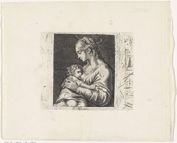 Curator: My first impression is a profound sense of intimacy, a hushed moment frozen in time. There's a quiet dignity about it. Editor: Indeed. The work you’re looking at is "Vrouw die een kind voedt," which translates to "Woman Feeding a Child," a genre painting by Karl Wibmer, created between 1874 and 1891. It's a drawing in ink. What draws me in is the convergence of the Madonna-like subject and the social realism of representing working class womanhood. Curator: Absolutely, there is such grace and love being shared. What strikes me too is the contrast between the smooth lines of the child, its soft vulnerable head and body, and the heavy, scratchy rendering of the mother, worn down by who knows what, to conjure what might have been Wibmer’s vision of sacred love, with a more earthly understanding of its implications for both participants. Editor: And those darks, that deep chiaroscuro, create an interiority, an enclosure, a space outside of societal scrutiny or approval, which, given the time period, could be argued as radical. How does that density of ink alter your view of the subjects themselves? Curator: The darkness feels protective. Like a swaddling blanket wrapping this pair away from judgement or expectations. Perhaps Wibmer saw and captured in ink, this common miracle, elevated to this unique status in order to make an uncharacteristically sensitive cultural and artistic comment on it? Editor: I see the swaddling as also highlighting vulnerability; the blanket is covering up the child’s body to protect it from harm in this dark atmosphere where resources might be so hard to find. Given what we know of artistic training in the late nineteenth century, it’s impossible that Wibmer, and audiences in that period, would not also consider this scene alongside well-known images of the Madonna and Child. So how does this scene borrow or challenge those established ideals? Curator: Borrow, for sure, with an underlying, perhaps necessary sentiment that can elevate their love; while challenge is necessary, to add complexity through lived experiences; after all the ink drawing of this Madonna represents a love for everyone, regardless of location in any particular social system. Editor: Wibmer makes no claim about any divine right of this woman to have the baby; no halo; yet he’s celebrating their human condition by depicting their everyday routine as sacred in his own understanding. That feels pretty transgressive even today. Curator: Yes, it’s as though he’s peeled back the gilded layers to reveal the quiet strength at the heart of that kind of everyday love. Editor: A quiet strength which, through his drawing, he encourages the viewer to respect without any questions. Curator: The perfect kind of art which reflects this message that everyone needs, and the quiet peace it suggests.