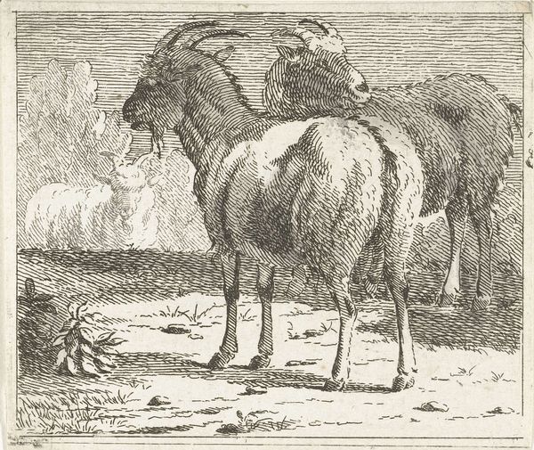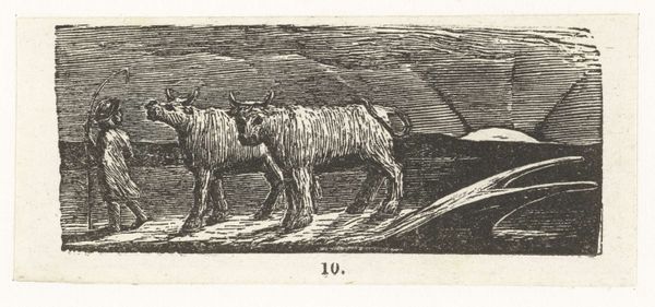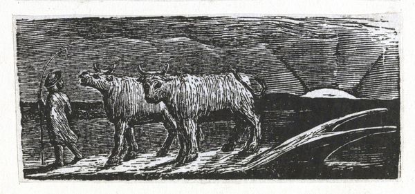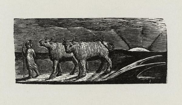 Curator: This is William Blake's "The Spiritual Form of Pitt Guiding Behemoth," currently held in the Tate Collections. Editor: It’s stark, almost severe. The rigid lines convey a sense of constraint, of power held tightly in check. Curator: Blake often used his art to critique political figures. Pitt, as Prime Minister, was seen by some as a guiding force, but Blake’s imagery suggests something far more monstrous. The behemoth, a biblical beast, represents uncontrolled power. Editor: The composition is quite striking. The sharp, almost brutal, lines create a sense of unease. See how the dark lines carve out the forms, especially in the sky and the flanks of the animals. Curator: Blake was deeply critical of the social and political structures of his time, and this piece reflects his anxieties about the misuse of power. These anxieties are what he used his art to protest against. Editor: The monochrome enhances the starkness of his message. It’s all about contrasts: light and shadow, freedom and constraint. Curator: Absolutely. Blake aimed to expose the spiritual consequences of political actions. Editor: It's a compelling, if unsettling, piece. Its formal tensions mirror its subject matter.