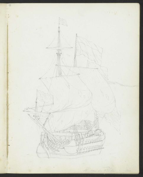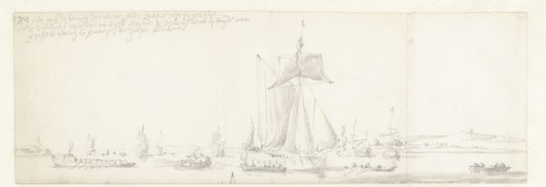 Curator: Before us, we have a sketch, a page from a sketchbook by Hendrik Abraham Klinkhamer. The piece, aptly titled "Studieblad met zeilboten en -schepen" which translates to "Study Sheet with Sailing Boats and Ships," was created sometime between 1820 and 1872. It’s currently held here at the Rijksmuseum. What's your initial read of this work? Editor: The lightness strikes me immediately. There’s a real economy of line here, creating this almost ethereal fleet. The grey pencil on the creamy paper gives a quiet, pensive feel. Curator: Indeed. It’s important to recognize that maritime scenes were often linked with the power of the Dutch Republic. However, by the 19th century, Romanticism shifts that representation. These boats are less symbols of might, and more like studies of humanity's relationship to nature. There is this inherent theme present where you feel like this isn’t about human triumph over the sea, but more of a humble interaction with its vastness. Editor: I can certainly see that, the delicate pencil strokes almost surrender to the negative space of the paper, hinting at the water's vastness. Thinking purely formally, observe the variety of shapes created simply with changes to the lines themselves. The artist uses this approach in his work here, with a focus on ships’ form and proportion, instead of just the sails. It provides a solid skeletal structure of the ship models. Curator: It invites us to consider labor and trade during this period too. Who manned these ships? What goods did they transport? The romantic era can often sanitize labor so a formal and historical perspective is necessary to understand art as situated, not simply created in a vacuum. We have to address this era as much more complex than the beauty it often presents. Editor: Agreed. Although his intentions are less legible on the page, Klinkhamer’s choice of material—the pencil on paper—suggests an impermanence, maybe something quickly sketched during observation or while traveling. You get the impression that he values the form just as much, if not more, than what they represent. Curator: I am intrigued by that tension. Klinkhamer invites the viewer to meditate not only on his aesthetic composition, but about who it includes and excludes. Editor: The convergence of historical context and pure form creates a nice ambiguity, wouldn’t you agree? Curator: Absolutely. And perhaps that is its quiet power: a space for reflection, and a moment to ask new questions.