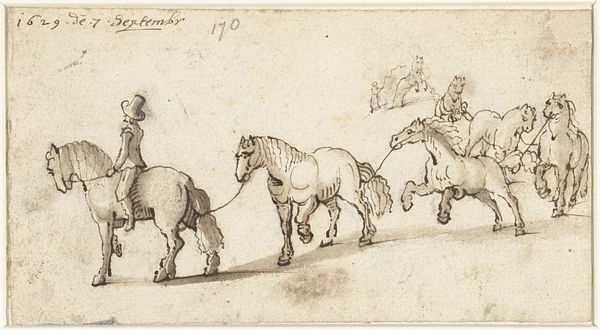 Stefano della Bella created this print, "Plate 21: horse, from 'Various animals'," using etching sometime in the 17th century. The composition immediately strikes us with its study of scale. A large horse dominates the foreground, its detailed form sharply contrasting with the miniature riders scattered across a vast, open plain. Della Bella plays with perspective, diminishing the figures into mere accents against the landscape. This use of scale isn't just about depth; it's about emphasizing the horse's dominance, perhaps reflecting the era’s fascination with power and control over nature. The etching technique itself, with its fine lines and delicate shading, adds to the sense of distance and atmosphere. Consider how these formal elements work together. It's not simply a picture of horses; it's a carefully constructed visual argument about the relationship between size, power, and the human-animal dynamic. The horse, rendered with precision, becomes a symbol within a larger, semiotic game.