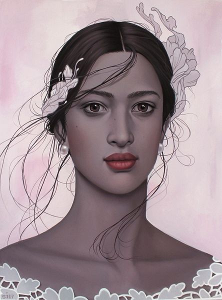 Editor: This is "Savannah Sunset" by Sarah Joncas, a figurative painting that includes an intimist portrait of a woman surrounded by flower decorations. The dark red color palette and floral patterns create an interesting contrast with her smooth, soft skin. How do you interpret this work, and what draws your attention most? Curator: I see a portrait that prompts us to consider the interplay between individual identity and cultural artifice. The floral patterns enveloping the subject are not merely decorative, they’re an active element in defining and perhaps constraining her. What does it mean to frame a female portrait with these types of traditionally feminine tropes, especially within a “sunset” backdrop, often linked with the romanticism of the exotic ‘other’? Editor: That's a great point, I hadn't thought of that tension between individuality and cultural expectations. So, is the sunset here simply background, or can it carry additional significance about romanticism? Curator: I believe it's the artist pushing the audience to consider how notions of beauty, identity, and gender are historically and socially constructed, playing off of existing aesthetic expectations. Think about the layers – the subject, the culturally laden flowers, the exoticized setting. Ask yourself, whose gaze is this painting catering to and what does it say about their perceptions? Editor: The layers of constructed identity you’ve highlighted really changed my perspective. I appreciate how you’ve drawn attention to the broader questions about gender and representation. Curator: Absolutely! And I think that's the power of art, isn't it? To continually challenge our understanding and encourage critical dialogue about the world around us.
