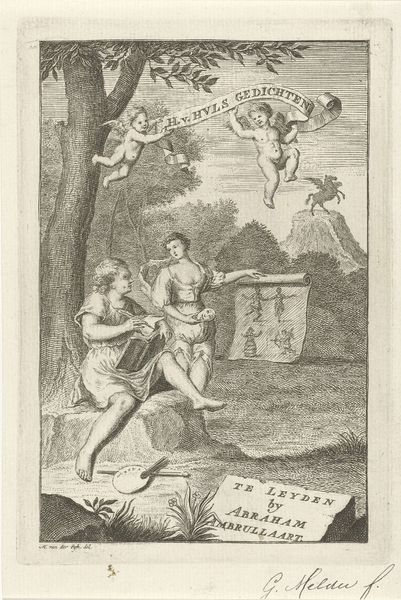 Curator: The textures in this print really caught my eye; what is your immediate reaction? Editor: Stark. The lines create high contrast, giving it an almost theatrical mood with the juxtaposition of mourning and… is that a jester? It’s jarring. Curator: That's right! This piece, dating from 1756, is an engraving titled "Allegorical Representation with Mourning Woman and Dancing Momus." It’s by an anonymous artist but published in Amsterdam by Jan Mortierre. Editor: "Momus?" I'm intrigued. Tell me more about the figure of the jester dancing across the foreground. His hat is wild! Curator: Momus, in Greek mythology, embodies satire and mockery. He often appears as a critic of the gods. So, in this print, we see him dancing seemingly oblivious to the sorrowful woman beside him. He carries a sign in Latin: "Dulcis medicina dolorum" or "sweet medicine for sorrows" Editor: So, is the allegory pointing to laughter, or distraction, as a way to ease pain? The city looming in the background – the sharp geometries, contrasting with the organic shapes in the foreground – suggest something artificial at play. Curator: Precisely. Look at the details: A child figure displays another sign about amusement for sale; a satyr-like musician sits playing idly. These elements collectively critique superficial pleasures that only mask deeper grief. Editor: Interesting. The artist uses a classical composition, directing your eye to this kind of central emotional axis where grief sits. Yet it feels fractured, disturbed by these conflicting images… perhaps even relevant today? Curator: Indeed. The print, with its detailed rendering, provides layers to explore; how do cultures cope with suffering through spectacle, entertainment, or other fleeting remedies? The questions still remain. Editor: Absolutely. A stark and potent composition; it reveals art's function to provoke reflection—and possibly discomfort. Curator: I agree, a small work on aged paper that prompts expansive thinking on timeless subjects.