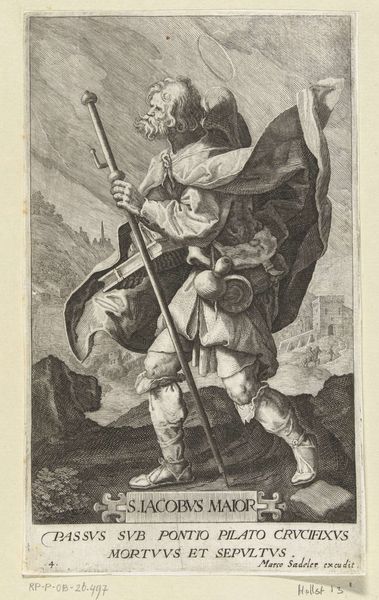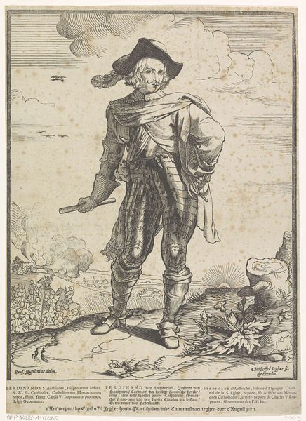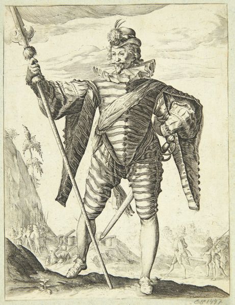 Editor: This is Hendrick Goltzius's "Musketier," an engraving dating back to the late 16th century. There's such confidence in the subject's pose, but the setting seems... precarious? What's your read on this piece? Curator: Ah, yes, the "Musketier." A compelling example of Mannerist printmaking. See how Goltzius uses the figure of the soldier. Not just as a representation of military strength, but as a vessel carrying deeper anxieties. The musket, the sword, all are symbols. What might they signify in the context of the Dutch Revolt, which raged during Goltzius's time? Editor: So, beyond the surface depiction of a soldier, you're saying these items represent the struggles of that period? Curator: Precisely. Consider the small scene behind the soldier – a distant battle, almost obscured. It points towards the ever-present conflict, shaping the individual's identity. Do you notice how the soldier, despite being armed and ready, also possesses a certain elegance, even vulnerability? Editor: I do. The lace collar, the decorative tassels. It's quite a contrast to the backdrop. Curator: Indeed. It highlights the psychological tension: the internal battle between duty, honor, and the brutal realities of war. What does the column of smoke evoke in you? Editor: Disquiet. Instability. Curator: Precisely! Visual elements speak to a broader cultural narrative. It allows the viewer to delve deeper than just the subject to understand a broader perspective of events and cultural contexts. Editor: I see now how Goltzius uses symbolism to create layers of meaning. Thank you, this insight really enriches my understanding of this engraving. Curator: My pleasure. Keep exploring, and remember: art is a reflection of cultural memory, and every image holds a story waiting to be deciphered.