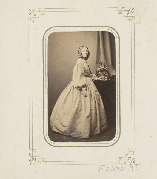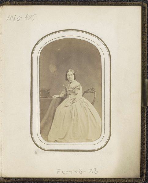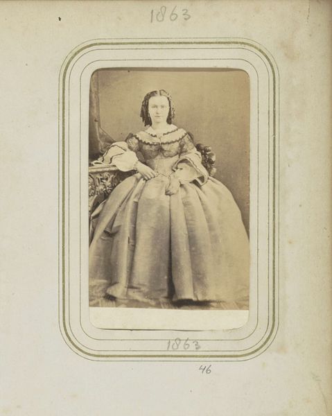 Curator: My first thought? Seriousness! An incredible stillness emanates from this young woman—almost palpable. It really grounds the piece, doesn't it? Editor: Indeed. We're looking at an albumen print from 1864. Its title, "Portret van een jonge vrouw met pijpenkrullen in een lange jurk," translates directly to "Portrait of a young woman with ringlet curls in a long dress." Curator: That is, literally, what we see. It's quite...direct. She appears in this voluminous, light-colored gown with what I imagine must have been quite fashionable at the time: intricate ringlets around her face. She’s wearing, what is that, a little striped bolero jacket? Editor: The jacket definitely adds to the structure. It provides an important formal context, and contrasts with the youthfulness suggested by her ringlets, perhaps giving us some information about how such portraits functioned to consolidate social position at the time. The artist, by the way, is recorded as Wm. Cobb. Curator: Cobb captures her reserved grace quite skillfully. It feels formal, certainly, yet there’s a whisper of melancholy in her expression that transcends the photographic process itself. It gives her presence, sets her apart, in a way that's deeply compelling. It must have taken forever to pose for such a photo back then! Editor: Given its existence as a photographic portrait during the mid-19th century, there’s that push and pull, that tension, between emerging bourgeois aspirations of upward mobility and established structures of patriarchy and hierarchy—it suggests her image operates both as a display of individual achievement and as a tool for enforcing certain forms of normative behavior. Curator: Yes, there's something simultaneously captured and held. It’s a potent intersection to consider and, despite the literal rendering of the subject, still feels open. Thanks, Cobb. And you, for highlighting how an image carries history so readily. Editor: And thank you, for pointing out the magic a single gaze can hold across centuries.