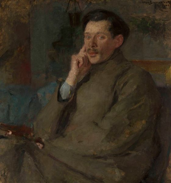 Curator: Here we have Olga Boznanska’s 1893 oil on canvas, "Portrait of Paul Nauen." A striking likeness, wouldn’t you say? Editor: Immediately, I'm struck by the melancholy...that dark palette! He appears isolated, almost swallowed by the gloom despite the flashes of red in the patterned chaise. Curator: Yes, the color values play a vital role here. Boznanska masterfully employs a limited palette, pushing the boundaries of tonal painting. Observe how the severe blacks and muted greys articulate Nauen's form against the amorphous background. This lends itself to the somber reading. Editor: Absolutely. But is it *just* melancholy? Look closer at his rings, that carefully placed teacup – symbols of cultivated ease and, perhaps, a hidden self-regard. Tea drinking was definitely important at the time, especially for the middle and upper class, and we can see these class attributes in the teacup. Curator: That's an astute reading. Consider also the positioning of the subject's hands—gestural and suggestive. They direct the eye and establish an internal rhythm which creates visual stability with underlying dynamicism. The rings too may simply point to artistic or upper middle class aspirations and status through decoration. Editor: Possibly. Still, I read that hand gesture as ambivalent, self-conscious. A modern sensibility wrestling with societal expectations. And tea drinking carries the entire weight of social performativity, both intimate and on public view. Curator: Perhaps Boznanska invites multiple interpretations. She clearly controls the visual language to leave us slightly unsettled. We're drawn in, but kept at a remove, and, yes, left unsure. The very lack of clear narrative is compelling! Editor: Agreed. It is this ambiguity that renders “Portrait of Paul Nauen” so richly resonant. It transcends being merely a representation and turns into a cultural text to decode. Curator: Well put. It also exemplifies her skill, transcending traditional portraiture. Editor: An invitation, then, to continuously unravel these mysteries embedded within. Thank you!