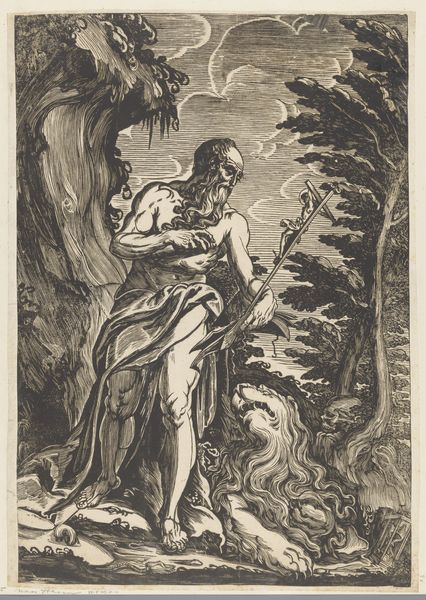This is Girolamo Olgiati's engraving "Heilige Hieronymus". The composition immediately strikes us with its division between light and shadow, a visual dichotomy that invites contemplation. The figure of Saint Jerome is illuminated, drawing our eyes to his contemplative pose. Olgiati employs hatching and cross-hatching to create tonal variations and textural contrasts, from the smoothness of skin to the roughness of the landscape. This detail serves not only an aesthetic purpose but also a symbolic one. In semiotic terms, the sharp contrasts could be read as signifiers of the tensions between the material and the spiritual. The formal arrangement invites us to consider how it challenges fixed meanings. The saint is accompanied by a lion, traditionally a symbol of strength, here seemingly subdued and tamed by the saint's piety. The skull and crucifix nearby further underscore themes of mortality and redemption. The artist invites us to interpret and reinterpret these symbols in relation to human existence.