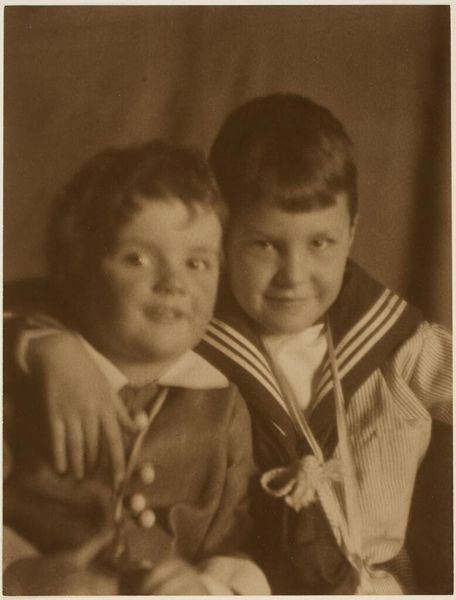 Editor: Here we have "Untitled (studio portrait of boy with two younger twin sisters)" by Martin Schweig. It's a black and white photograph, quite formal, but also has these little markings all over it. What do you see in the means of production of this work? Curator: The markings are key. This isn't just a photograph, it's a photographic *proof*. Notice the studio stamp. The materiality speaks to a process, to labor, to consumption. The photographer's markings indicate selection, decisions, perhaps even negotiations with the family. It’s not the final product, but a stage in its creation. Editor: So, it’s about what went into making the final photograph, more than the image itself? Curator: Exactly! Consider the social context of studio portraiture. It’s about aspiration, presenting a carefully constructed image of the family to the world. Even this 'proof' reveals those aspirations. Editor: Interesting, I never thought about it that way! Curator: Thinking about the means of production really changes how we see it.