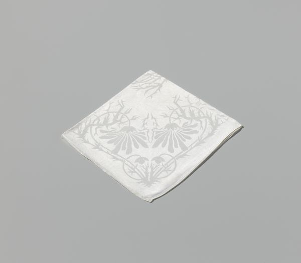 This is a linen damask napkin with a Marguerite design, crafted by Cornelis van der Sluys. The square form is softened by the intricate floral pattern. The tactile quality of the linen invites a sensory engagement beyond mere visual appreciation. The design features daisies and foliage woven in a subtle interplay of raised and lowered surfaces. This detailed patterning suggests an engagement with the principles of structuralism. The napkin, typically a mundane object, is elevated through its design. It transcends its utilitarian purpose to become a site of aesthetic contemplation. The monochromatic palette, while understated, serves to emphasize the texture and the dimensionality of the weave. This napkin challenges our assumptions about value and artistry in everyday objects. The careful arrangement of botanical motifs reflects a semiotic encoding, where nature is not merely depicted but also symbolically represented. It invites us to question how meaning is constructed through both design and utility.