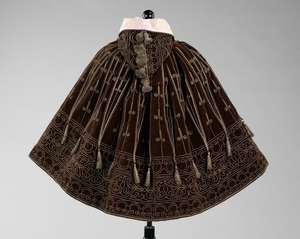 This evening gown was made from black crepe, by an unknown maker. Crepe is an interesting material: usually silk, wool, or synthetic fiber, it's distinctive for its crinkled or puckered surface. The question is, how did the maker achieve that texture? Typically, crepe gets its character from the weave structure or chemical treatment. This would have been a mechanized process, and in fact, crepe became popular in the 19th century precisely because of industrialization. Its appeal resided in this combination of qualities, both matte and refined. The velvet trim on the skirt and bodice offer a contrast. Crepe fabric was often associated with mourning attire, because of its somber tone. As such, this gown speaks volumes about the social rituals surrounding death, and the way that even grief could be expressed through the latest fashions. The dress presents an intriguing case study in the confluence of industrial production, aesthetic preference, and social symbolism. It reminds us that even the simplest garment can be a complex cultural artifact.