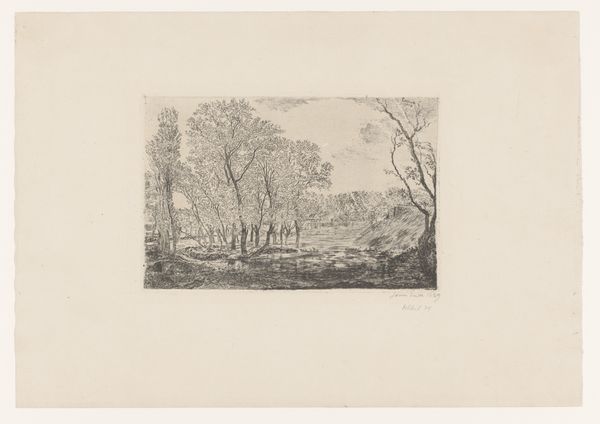 Hendrik Weegewijs made this small etching of Oud Blaricummerweg, or 'Old Blaricum Road,' and what strikes me first is its incredible detail, achieved with such simple means. Look at the trees. The etching allows for these spidery, delicate lines, creating a network of branches against the sky. It’s like he’s mapping out the negative space as much as the trees themselves. The texture of the grass and the suggestion of a path are all built up with these tiny, almost frantic marks. It's easy to imagine Weegewijs hunched over the plate, meticulously building up this image, line by line. You can feel the labor, the slow, deliberate process. There's a quiet intimacy in this piece, reminiscent of other Dutch landscape artists like Rembrandt, who found beauty in the everyday. There is a real sense of embracing the process, finding depth in what at first glance seems like a very humble subject.