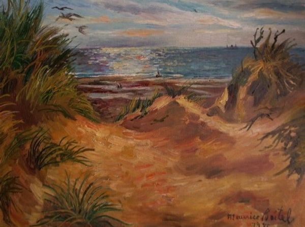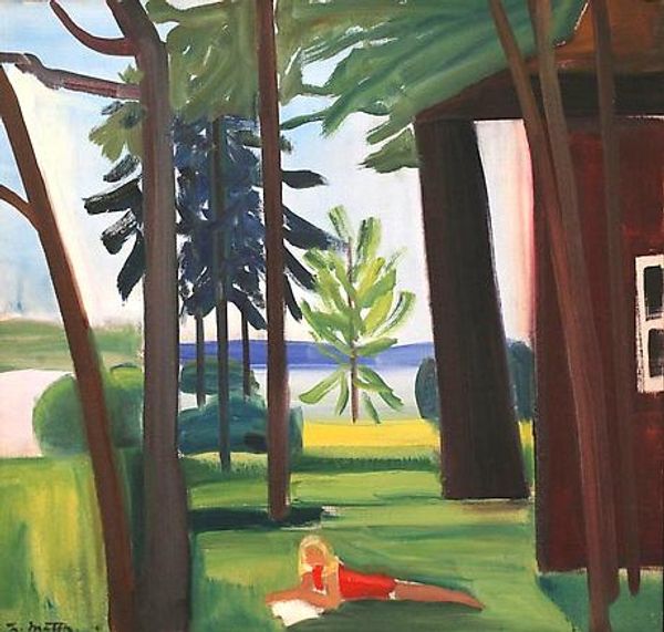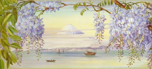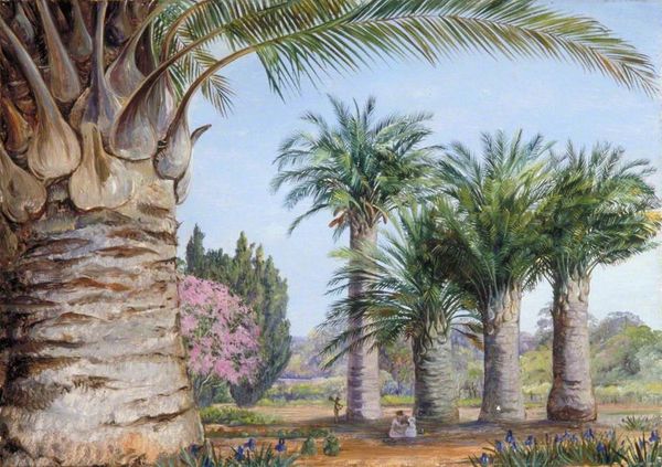 Curator: Marianne North’s “Bananas and Rocks at Paquetá, Brazil,” presents us with a striking coastal scene. It’s believed she created this plein-air oil painting during her travels. Editor: It’s visually dense, almost claustrophobic. The light, though bright, struggles to penetrate the thicket of vegetation. There's a feeling of humid closeness that almost overwhelms the scene's potential beauty. Curator: Indeed. Note how North deploys her materials. The heavy brushstrokes create texture. Look closely, and you'll see how she builds the rocks and foliage, implying mass through layering. I wonder what local materials – specific pigments and canvases – were available to her during her travels to Paquetá? Did these influence the materiality of the image itself? Editor: Let's not forget the societal implications! North, a Victorian woman traveling alone to these remote locales, documented flora. She was part of a colonial system of resource extraction and knowledge production. Who was truly benefitting from her scientific and artistic observations in this Brazilian context? Was she, inadvertently or not, contributing to a larger narrative of imperial dominance? Curator: That’s a crucial point. Yet, the bananas themselves, prominently featured, represent local agricultural production. What kind of exchanges did she make with those tending them? Or, from where was the actual banana harvested in this view, as represented in this picture? It provokes questions of global trade at that historical moment. Editor: Absolutely. And the small boat—abandoned, yet centrally placed—it feels laden with questions about labor, travel, the people arriving on such distant beaches... Where are the boat’s workers now, where has that boat already come from? The work is imbued with unseen layers, asking a much bigger social and political questions. Curator: I agree, and her method highlights the physicality of painting and underscores its link to production. This piece urges us to remember the artist's agency, not merely as a recorder, but also as a craftswoman negotiating the available local resources and the prevailing art market trends. Editor: The beauty and limitations of representation – all tangled within those vibrant green leaves. We see how even seemingly objective landscape painting always has some embedded, subjective, position and message to convey. Curator: Exactly, the making of "Bananas and Rocks" can prompt important queries about both its production and its place within its colonial era. Editor: It makes us think, beyond surface appearance, and toward broader human histories and lived contexts within our world's ecology.