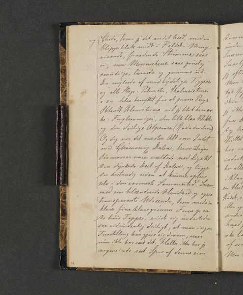This is a page from Johan Thomas Lundbye's travel journal, likely dating to the 1840s, made with paper, ink, and a leather binding. The dense, handwritten script, penned with iron gall ink, speaks to the intimate and immediate nature of the artist’s observations. Notice how the ink has slightly eaten into the paper over time, a testament to its reactive properties and the slow, relentless march of material degradation. The book’s small size, and the evident wear on its binding, suggests a life lived in transit, constantly opened and consulted. The journal is a direct connection to Lundbye’s experience of the world. The labor is evident not just in the writing itself, but in the very act of carrying the journal, recording thoughts and impressions, and building up a personal archive of experience. Ultimately, the value of this artwork isn't just in its aesthetic qualities, but also in the labor, the personal journey, and the social context it represents.