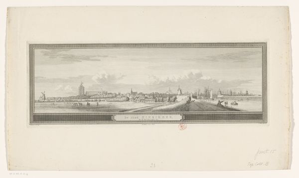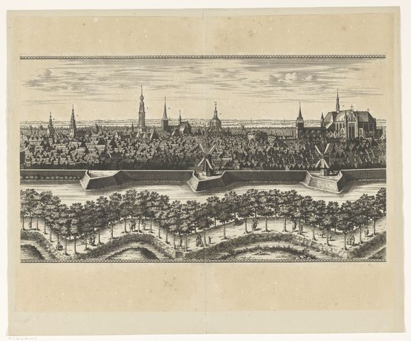 Editor: This is Johan Conrad Greive’s "Panorama van Amsterdam," a print made with etching and ink some time between 1847 and 1891. I’m struck by the detail; you can really get a sense of the city’s layout. What draws your eye in this piece? Curator: Immediately, it's the sheer volume of visual information presented – almost like a memory palace laid bare. The skyline bristles with spires, each one an echo of civic pride and religious authority. Note how the walled edge contains and defines what is within. Do you see any indications about Amsterdam's connections to other parts of the world? Editor: Well, there are a lot of boats… different sizes. That probably meant trade. Curator: Precisely! The vessels sailing in and out connect Amsterdam not only commercially but culturally with distant shores. Think of the spices, the textiles, the ideas flowing into the city, all carried on those hulls. How do you think Greive uses light and shadow in this print? Editor: It's interesting; everything is rather uniformly lit. It doesn’t feel like there’s a dramatic source of light; the etching treats everything evenly. It lends a certain… objectivity, perhaps? Curator: Yes, that evenness almost flattens the space. But it also invites us to linger, to absorb the city piece by piece. The realism carries a deliberate and strong message of trade and openness for Amsterdam. Consider those who lived, worked, and dreamed within these walls and waterways, as seen in an artistic legacy. Editor: I hadn't thought of it that way, but seeing all of those details adds a depth to what could easily just be another landscape. It's like seeing a collective memory being put on display. Curator: Indeed, and visual records such as this helped form a cultural narrative that defines not just a city, but its identity through the passing of time. A legacy built from cultural symbols and tradition.