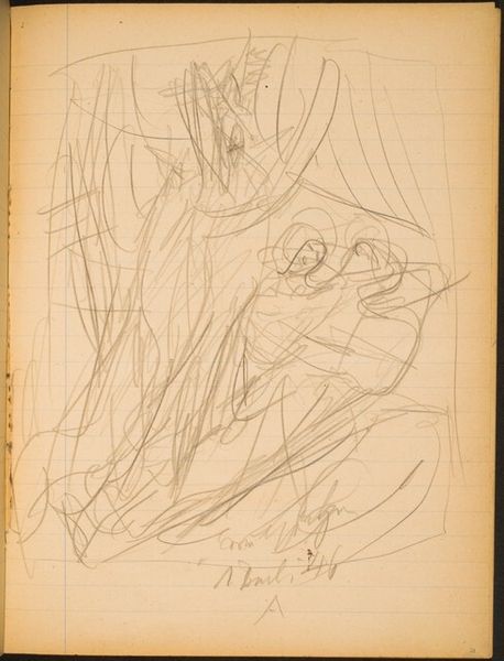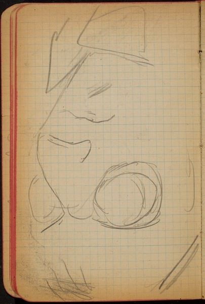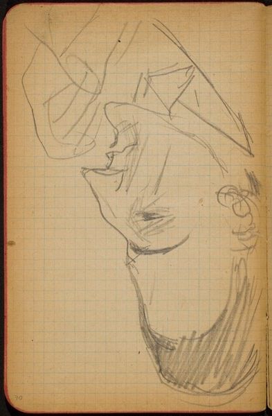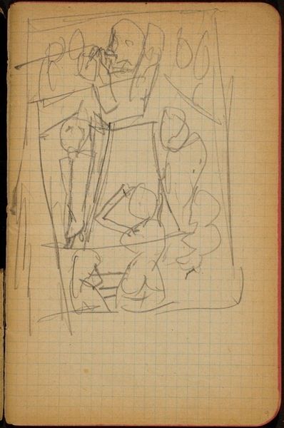 Editor: We are looking at Max Beckmann's "Figur mit Händen am Kopf," created with graphite around 1918-1919. It's a fairly raw drawing on what appears to be graph paper, and its starkness definitely conveys a sense of anxiety. What stands out to you? Curator: Indeed. Note how the artist exploits the stark linearity achievable via graphite, crafting a schematic form verging on abstraction. It's crucial to acknowledge that the work's aesthetic power rests in its compositional tension, not a mimetic likeness. Observe how Beckmann disrupts expectations; facial features are mere indications rather than definitive markers of identity. Editor: So, it's less about the accuracy of the representation and more about the overall form itself? Curator: Precisely. Beckmann is not just drawing a figure; he's constructing a visual architecture. The angles, the juxtaposition of defined versus implied lines - these create a dynamic and challenging space for the eye to navigate. Notice how your eye jumps around the page. What causes that effect? Editor: The incomplete lines make me try to fill in the blanks, and there isn't an obvious point of focus, is there? It’s fascinating how the limited marks build such intensity. Curator: Correct. It is in this visual tension that the artwork fulfills its expressive potential, demonstrating how formal decisions constitute meaning themselves, transcending mere representation. Editor: This has really adjusted my perspective on interpreting drawings. I appreciate learning to look beyond the subject matter. Curator: And I hope that you have observed how form and content intertwine to inform each other.