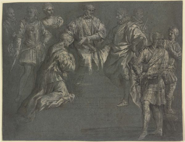 Editor: Here we have a drawing by Jacopo Ligozzi, whose title translates to "On the stairs of a palace, a man is called from the clouds by a saint." The piece is rendered in ink, chalk and gouache on paper. I am struck by the dramatic tension in the composition, but unsure about the meaning of the figures. What do you see in this work? Curator: The drawing encapsulates the baroque tension between divine intervention and earthly power. Ligozzi, working in a period of significant religious and political upheaval, presents us with a nobleman disrupted in his stately procession. The calling down of a saint speaks to the anxieties surrounding power, faith, and legitimacy during the 17th century. Editor: It's interesting how the heavenly figures contrast with the solid, almost imposing, presence of the palace architecture. Curator: Exactly! And think about the implications of divine judgment for those in power. What does it mean when authority figures claim their rule is ordained, yet are perpetually subject to external validation? Editor: So, this isn't just a depiction of a biblical scene; it's also a commentary on the political landscape of the time? Curator: Absolutely. It subtly interrogates the justifications for social hierarchy and challenges the presumed stability of these systems. Ligozzi uses a historical scene to spark critical consideration of how power is obtained and maintained, wouldn’t you agree? Editor: Definitely. It adds so much depth to consider how the piece connects with cultural contexts beyond the surface level of the subject matter. Curator: Indeed. Art is so much richer when viewed through an intersectional lens that reflects historical struggles of power and privilege. Editor: Thank you for helping me to broaden my understanding!