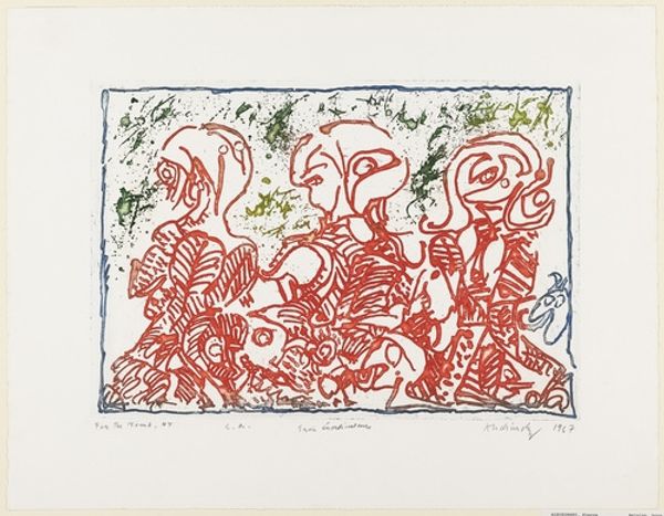 This is Wassily Kandinsky's 'Klänge Pl.11', and looking at this woodcut, I’m thinking about how the process of art-making can open up new ways of seeing and feeling. Kandinsky’s working here with just three colours, red, blue and white, forcing all the meaning out of these basic elements. Look at how he lets the white of the paper act as a kind of chaotic ground. The red and blue shapes lock together on top of the paper, like pieces of a strange puzzle. Your eye is drawn to the circle of red in the upper center, which seems to radiate energy outward, connecting all the other elements. The crude marks, like small dents in the paper, give it a tactile quality. I think of someone carving into the wood, wrestling with the material to find these essential forms, like Giacometti. It’s about embracing ambiguity, allowing for multiple interpretations. It becomes a space where different ways of thinking and experiencing the world can coexist, unresolved, open.