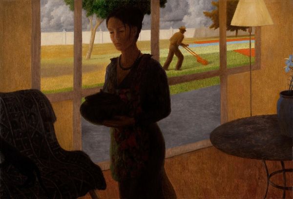 This artwork, titled "Sisters," created by Iwo Zaniewski, captivates with its exquisite use of colored pencil. The drawing’s grainy texture, built up from countless strokes, echoes the labor-intensive act of handcraft itself. We see two women engaged in a similar act of making, tailoring clothes in what looks like a domestic sphere, yet there is a table filled with spools of thread, indicating that the labor of clothing production is at the heart of the image. The muted palette of blues and reds contrasts with the bright pink and blue shirts worn by the women, drawing our eye to the labor in the foreground. Zaniewski has drawn the scene using densely layered marks, evoking both texture and depth. The artist invites us to consider how the very act of making, rendered visible through the medium itself, can imbue a seemingly simple scene with profound social commentary. The medium and process become intrinsic to the image, reminding us that even the most everyday activities are shaped by the hands that perform them.