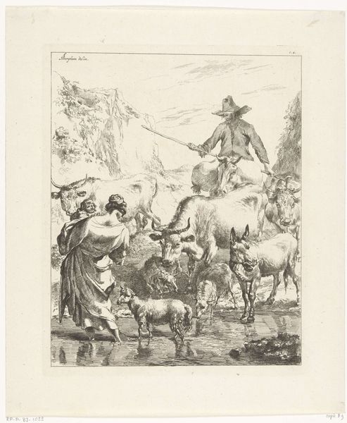 Curator: This etching, known as "Le Troupeau Traversant Le Ruisseau," or "The Herd Crossing the Stream," was created sometime between 1630 and 1683 by Nicolaes Berchem. It resides here at The Metropolitan Museum of Art. Editor: It strikes me as a carefully staged tableau vivant rather than a candid scene. The monochromatic texture makes the composition quite striking, despite its rustic theme. Curator: Note how Berchem masterfully uses the etching technique to create tonal variations and textures. Observe how each line is deliberately placed to define form, volume and spatial depth of field. It seems Berchem found aesthetic and financial reward when depicting Italianate landscapes. Editor: Yes, Italianate indeed! He capitalised on a real vogue amongst wealthy Northern Europeans eager to adorn their homes with impressions of the South. The idealised pastoral scene here presents a somewhat sanitised view of peasant life for urban tastes. Curator: Notice the careful balance and the symmetry in the layout. The animals crossing and their reflections create rhythmic horizontal patterns. This use of pattern guides the eye throughout the composition, creating a harmonious overall feel. It also plays on the concept of duality through mimetic mirror reflection, though its visual fidelity is inaccurate. Editor: Look at the clothing; a figure is seemingly robed in classical drapery like a biblical scene! I think this romantic idealisation of rural workers also played into emergent concepts of 'nationhood'. An artistic attempt to define shared ancestry in those living within the landscapes they romanticise. Curator: An interesting sociopolitical point that can certainly explain why Berchem often used precise, calculated arrangements of light and dark to evoke an almost dreamlike ambiance. A strategic tool to imbue the viewer with this artificial romanticism. Editor: Indeed, this reminds me that this image, at the end of the day, serves more than its mere aesthetic qualities or semiotic components. In truth, this art embodies so many ideals beyond just form and shape! Curator: Absolutely. The artwork highlights that understanding composition elements enhances the understanding of any image that communicates in and of itself without words. Editor: The analysis underscores the symbiotic relationship between aesthetics and societal implications. One doesn't exist entirely separate from the other.