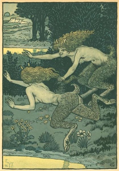 Eugène Grasset rendered these faunesses with ink and watercolor, conjuring ancient spirits into modern times. Here, Grasset captures the faunesses’ playful essence, their half-human, half-animal forms embodying a carefree existence in nature. The faun, a symbol of untamed wilderness and primal instinct, has roots stretching back to Greek mythology, where satyrs frolicked in Dionysian revelry. Their image recurs throughout art history, a persistent echo of humanity's connection to the natural world. In this artwork, Grasset presents the faunesses not as terrifying monsters, but as creatures of joy and liberation. Consider how these figures mirror images of nymphs and other nature spirits in classical art, which represent the enduring human desire to return to a state of natural harmony. This longing continues to resurface in the collective consciousness.