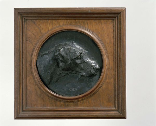 Curator: The profile portrait of William Evarts Beaman in His Fourth Year, dating from sometime after 1885, is a bronze relief by Augustus Saint-Gaudens. Editor: The work has a wistful and classical feel. It evokes something both modern and timeless through its simplicity of form. The material palette of dark bronze against warm wood contributes to its gravity. Curator: Indeed. Saint-Gaudens mastered low-relief sculpture, achieving a remarkable sense of depth despite the limited plane. Notice how the planes shift with changes to the light on the relief. This textural modulation amplifies form. The work provides the viewer with the illusion that the sculpture exists in higher dimension. Editor: These kinds of sentimental family portraits, especially of children, were highly popular during the Victorian era. These works became physical emblems of parental affection and also marked family status, meant to decorate the domestic sphere while subtly reinforcing prevailing social norms. Curator: In this example of relief carving, the careful handling of light and shadow plays such an important role. Take note of the way Saint-Gaudens textures and contours the boy’s hair to direct the viewer’s gaze. We're asked to concentrate on William’s delicate features and his almost ethereal mien. Editor: The work also signals shifts in American society, documenting a time when the middle classes increasingly used art to solidify their status and broadcast it publicly, not unlike sharing family snapshots on Instagram today. It's also difficult not to view this outside the context of high child mortality at the time. The sentimental style reads a bit differently, when the portrait itself could easily become a memorial. Curator: These societal influences become particularly evident upon close inspection of the lettering within the roundel, a design detail that gives visual prominence to the child’s name, along with the inscription noting his age at the time of creation. The wooden frame with floral details also invites contemplation on the sculpture's wholeness and intended aesthetic effect. Editor: Overall, it's a complex interplay between personal sentiment, technical virtuosity, and social display. Curator: Absolutely. The bronze and wood work is far more than merely the depiction of a child—the artist used carefully controlled textural nuances to make this intimate family artifact resound within broader societal spheres.