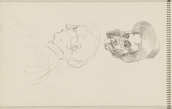 Curator: On display here is a drawing by Carel Adolph Lion Cachet, "Two Women," dating from around 1930, a modern pen and ink sketch currently held at the Rijksmuseum. Editor: It looks like an experimental doodle. Loose, flowing lines, almost weightless... yet, it's captivating, isn't it? Raw. Curator: Cachet came from a background deeply embedded in colonial mercantile society. His journey toward becoming an artist speaks volumes. What do you mean by raw? Editor: The hurried quality of the lines! Notice how the artist captures the essence of form with minimal strokes? See where the pen never leaves the page, looping back? This emphasizes the volume of the hat on the right figure. There's confidence in that gesture. Curator: Cachet's portraits of women, particularly those connected to Indonesian society, often present a very deliberate projection. While this sketch captures movement, he lived and worked between cultures. It's essential to remember the social context of Dutch colonialism that influenced his approach. How might those ideas affect the work or what he could freely represent in the gaze of a fellow colonial subject, or in this case, two possible models. Editor: A colonial subject's perspective undoubtedly impacts this art. How might his work contribute or react against accepted aesthetics or artistic styles of his era. Do you find references to symbolism here? Curator: Hard to ignore how Cachet and his contemporary artists broke traditional modes of depiction to re-negotiate the perception of representation itself. It is fascinating. Thanks for that insightful conversation. Editor: A pleasure. I'm seeing the relationship between Cachet and social dynamics more clearly now.