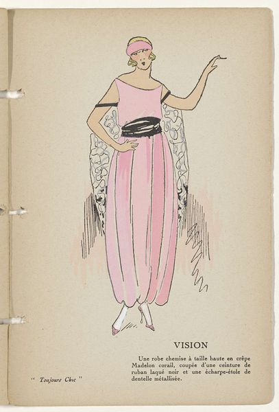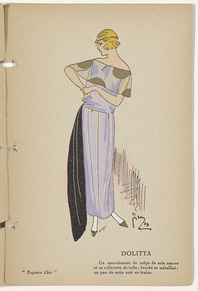 This fashion plate, titled ‘Toujours Chic, Toilettes de Soirées, Hiver 1921-1922: Genet’ was designed by G-P. Joumard. It’s a study in the art of suggestion, rendered with graphic lines and vibrant color. The genius of this lies in its simplification. The dress, a striking yellow and black number, hints at form without being overly descriptive. Look at the way the black panels at the bottom of the dress are rendered. Each panel is outlined with a steady hand, and then filled in with a flat, velvety black. It's an almost architectural approach to drawing, building a structure with bold strokes. I think of designers like Sonia Delaunay, who also experimented with geometric forms and bold colors. Joumard, like Delaunay, suggests a modern woman, striding confidently into a new era. Ultimately, it’s about how we see. It’s about how a few well-placed lines and colors can conjure a whole world of style, sophistication, and the ever-elusive “chic”.