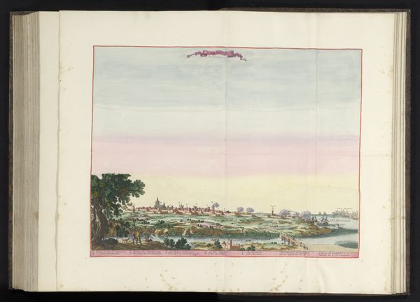 Curator: Let’s turn our attention to this intricate rendering of Montpellier, titled “Gezicht op Montpellier in vogelvluchtperspectief”, or “Bird’s-eye View of Montpellier.” It dates roughly from 1610 to 1657. Editor: It’s rather charming! I’m struck by the soft pastel hues—that delicate transition from rose to sky-blue—offset against the miniature detail of the city itself. A strange harmony, isn’t it? Curator: Indeed. Consider the historical context. Cityscapes like this weren't merely aesthetic; they served as strategic documents. Montpellier was a significant urban centre—the image is not just capturing topography; it's an assertion of power. Maps became political tools, portraying controlled space. Editor: The use of line certainly supports that reading. Observe how the artist has structured the image. The strong horizontal divisions – sky, cityscape, foreground – give a sense of order. Note the winding river in the foreground too. It creates an intentional frame. It all feels very controlled, deliberate. Curator: Precisely. And the fact that it is anonymous also speaks to the way the representation served the purposes of larger institutions and individuals with interests in mapping territory for a variety of ends. Its initial production was less about artistry and more about utility, offering valuable intelligence regarding resources and military installations. Editor: Still, I can't ignore the drawing itself. The use of watercolor over print...that contrast between hard line and fluid wash is incredibly striking. I wonder about the intended audience; who was meant to interpret these signs and symbols? Curator: People in positions of authority, mostly. This perspective was about visualizing control, projecting it onto those who could use it for governing— or potentially dominating—the city. Editor: And there’s a sense of that imposed order radiating outward, even now. Although the piece feels very much of its time, with its careful symbolism. Curator: A testament to how maps can be far more than simple representations, shaping perceptions, controlling narratives, and serving very definite interests. Editor: Exactly, this small artwork condenses power, art, and spatial strategy. Very striking.