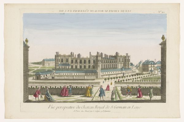 Curator: Here we have "View of the Château de Vincennes" by Jean-François Daumont, a print created sometime between 1745 and 1775. The work exemplifies rococo landscape and cityscape engraving. Editor: It's a rather striking tableau. Immediately, the scale jumps out at me; it's almost dreamlike in its flattening of perspective, isn't it? And yet, despite this, I appreciate how it feels, dare I say, alive. Curator: Alive because the making process is so clear. Consider how Daumont’s hand guides our gaze, deploying hatching and cross-hatching to simulate textures – the rough terrain versus the smooth facades, the orchestration of social hierarchy. It serves less as an attempt to deceive, and more to demonstrate skill, the production value itself. Editor: Precisely. The controlled use of line and perspective, organized within the rectangular frame, draws attention to the overall balance and symmetry. Do you see how the building itself almost dictates the composition? Curator: An intended result, I suspect. Notice too the muted coloration and the very visible labour of it all; one immediately imagines the printing, the press…it's as though it wishes for you to observe it within the system it emerged. A visual statement, perhaps? Editor: Quite so. The Château dominates, symbolizing power, while those miniature figures populate the foreground adding an air of everyday life—of leisure—but simultaneously highlighting a social stratification in how their dresses draw the eye more than the masculine garb. How fascinating that the very making and presentation reinforce these existing conditions. Curator: So in its intricate details and balanced structure, it achieves a complex reflection of 18th-century aesthetics, doesn’t it? The engraving invites analysis beyond mere representation. Editor: An analysis made all the richer through attention to how the artifice reflects its societal creation, certainly. Something to contemplate!