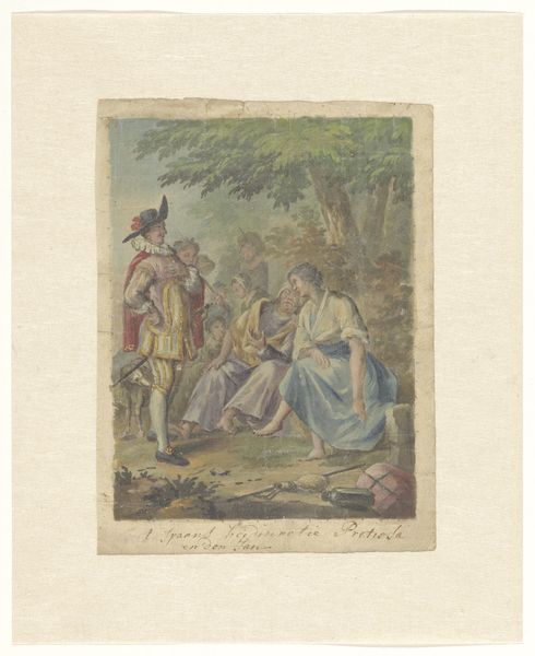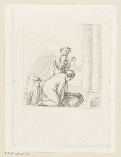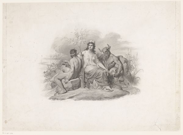 Editor: This is Friedrich Rehberg's "Three Young Men," made around 1793, using drawing and engraving on paper. It gives off a melancholic vibe with those figures huddled together, almost as if they're sharing a sorrowful secret amidst this expansive landscape. What do you see in this piece? Curator: Focusing on its formal structure, the engraving presents a fascinating study in contrasts. The stark linearity of the architectural elements in the background plays against the curved, almost yielding postures of the figures in the foreground. Notice how the artist utilizes light and shadow, or rather, the relative absence of them, to flatten the pictorial space. Editor: Flatten the space? How so? Curator: Observe the subtle tonal variations. Rather than creating depth through chiaroscuro, Rehberg employs a consistent level of etching. This flattens the picture plane, pushing the background castle closer to the foreground figures. This manipulation subtly challenges our perception, no? Editor: I suppose. I was more drawn to the composition. Three figures dominate, but their poses... one leans heavily, another shrouded. Does that interplay signify anything structurally? Curator: Consider their arrangement. The figures are deliberately positioned asymmetrically, with the draped figure acting as a visual anchor to the right. This imbalance generates a sense of tension, heightened by the shared but largely obscured space around them. We might ask, how does the composition encourage or discourage the viewer's active engagement with the narrative elements? Editor: That's interesting. I was too caught up in imagining a story, but seeing it from a formal view, the imbalance is far more striking now. Thank you. Curator: The pleasure is mine. Hopefully you see now the power of close reading, seeing the interplay between form and content within a seemingly simple engraving.
