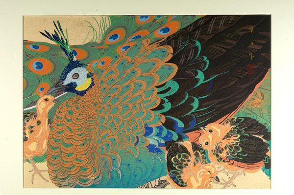 Editor: This woodblock print, titled "Peacock" by Tsuchiya Rakuzan, captures the bird's vibrant plumage. The detail is incredible, what strikes me is the overall impression of luxury and pride. What symbols stand out to you in this piece? Curator: The peacock, across cultures, embodies transformation and immortality, its resplendent tail feathers mirroring cycles of renewal. Do you notice how Rakuzan uses color to evoke this? Editor: Yes, the blues and greens seem to shimmer, suggesting movement and life beyond the static image. I see why it suggests renewal. Curator: Precisely! The peacock's symbolic weight shifts – from vanity to vision – revealing how imagery carries cultural memory and deeper psychological associations. Editor: I hadn't thought of the shifting meanings. I'll definitely consider how cultural memory shapes my understanding of art from now on. Curator: Indeed, it is in such symbols where the past truly speaks to us.
