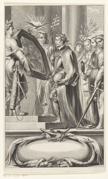 Curator: Looking at Giorgione's “Madonna and Child with Saints Liberale and Francis," painted around 1505, one immediately notices its somewhat detached atmosphere, wouldn't you say? Editor: Absolutely. There is a remarkable serenity, an almost dreamlike stillness in this oil painting. It's as if the figures exist in separate psychological spaces, connected but not quite engaging. The checkerboard floor provides a rational counterpoint to this dream. Curator: Indeed. The composition adheres to a strict geometric logic. Note the pyramidal structure, anchoring the Madonna and Child at its apex. It provides a sense of stability amidst the painting's gentle mood. But more compelling to me are the layered symbols woven throughout. The figures of Saint Liberale, the armored warrior with the banner, and Saint Francis are not merely aesthetic elements; they’re deeply rooted in local and spiritual identity. Editor: Saint Liberale, the patron saint, standing in full armor represents Castelfranco’s military prowess but is counterpointed by Saint Francis. He stands for humility, yet is rendered nearly at the same height and poise. The inclusion of these figures places the Virgin Mary not just in a divine sphere, but grounds her firmly within the earthly concerns and realities of the Venetian Republic. The architectural frame reinforces her sovereignty and power. Curator: And let us not forget the landscape. The positioning of the Madonna before an open landscape, framed architecturally, directs our gaze beyond the immediate space into a broader realm. Her gaze guides you into the unknown. She also seems physically disengaged and distant, perhaps she represents idealized divinity. Editor: Precisely! That liminal space, the background where everyday people occupy a sublime nature is itself an Italian cultural memory. It serves to constantly remind the public of the glory that may await. But the real brilliance of Giorgione’s work here lies in the seamless integration of the divine and the temporal. He gives the promise of Christian iconography and cultural continuity. Curator: So while the interplay of composition offers structural stability, the iconographic choices offer symbolic richness. Together these devices speak of the harmony between spiritual promise and earthly life. Editor: A fascinating and ultimately calming synthesis. Its visual poetry lingers long after one turns away.