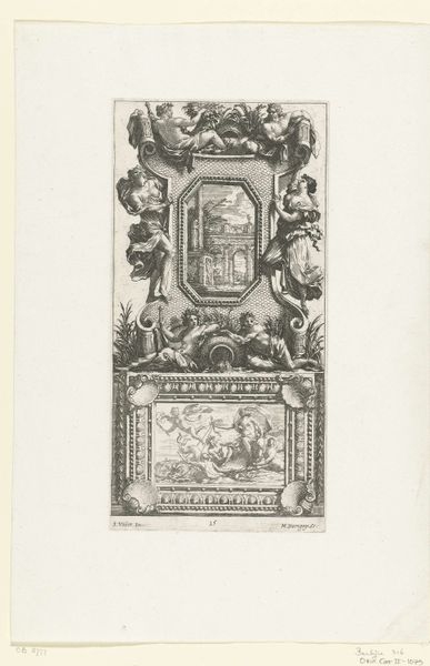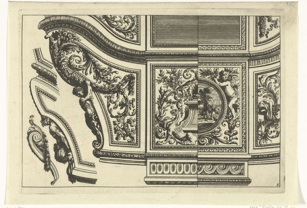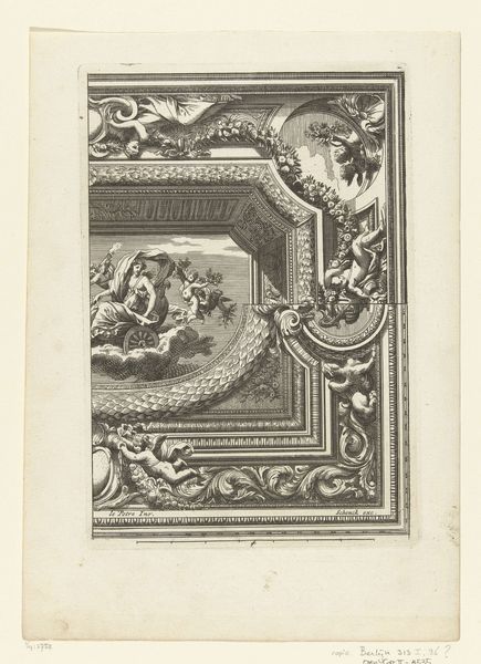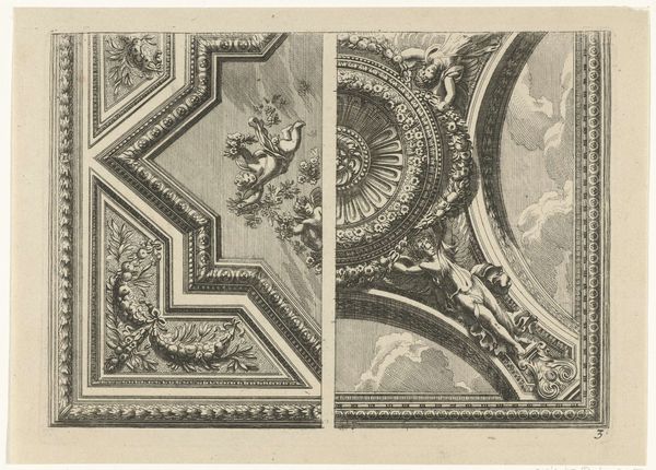 This print, "Twee kwarten van plafonds," was made by Susanne Maria von Sandrart, likely in the late 17th or early 18th century. It’s made using engraving, a printmaking technique involving cutting lines into a metal plate, inking it, and then pressing paper against it. This design for ceiling decoration gives us a privileged glimpse into the world of interior design of the period. Look closely, and you can see the intricacy that would have been involved. The cherubic figures, foliage, and architectural details are all rendered with impressive precision. The creation of such a print was a laborious process, demanding the work of a highly skilled artisan. Prints like this allowed for the dissemination of design ideas at a time before photography, when architectural details, patterns, and ornamentation could be shared more widely. This blurring of fine art and the decorative arts invites us to reconsider these hierarchies, and see how closely they are intertwined.