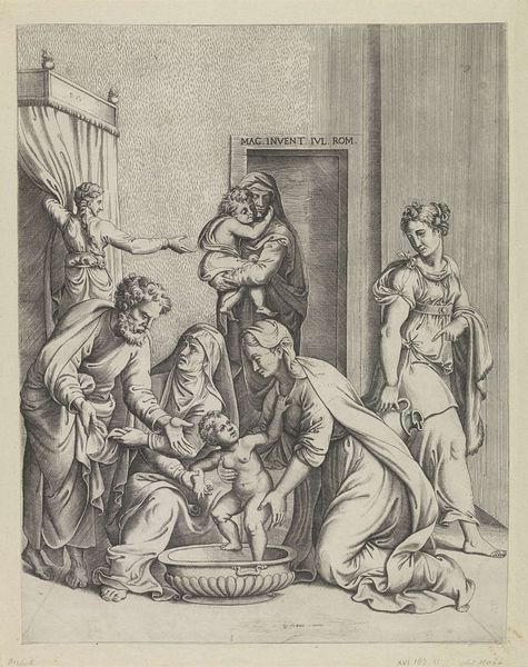Giovanni Battista Fontana created this small engraving, The Birth of the Virgin, sometime in the second half of the 16th century. The scene depicts the traditional story of the Virgin Mary's birth to her parents, Anne and Joachim, attended by midwives. Produced in Italy during the Counter-Reformation, this print reflects the period's renewed emphasis on religious orthodoxy and the promotion of key Catholic figures, particularly the Virgin Mary. This was a period when the Church authorities sought to harness the power of images to reinforce religious doctrine and inspire piety among the faithful. The print participates in this project by presenting the birth of the Virgin as a miraculous event, emphasizing her purity and divine nature. To understand the image better, one might consult theological treatises and Church records from the period to understand the social and institutional context that gave rise to its creation. Only then can we fully appreciate the ways in which Fontana's print reflects and reinforces the religious and social norms of its time.